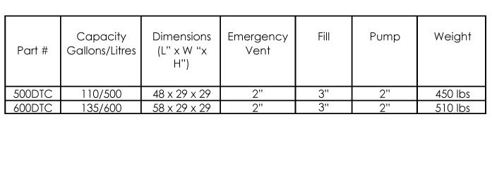- 110 gallon (500 litres) or 135 gallon (600 litres) capacity